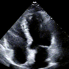 Echocardiograms, or echos, are black-and-white videos of a cross-section of a heart. The angle you choose to hold the wand at relative to the patient’s heart determines what “slice” of the heart you can see. The most common angle is called the Apical 4-Chamber View (A4C), and as the name suggests, it lets you see all 4 chambers of the heart at once, beating in real time. Here’s an example: