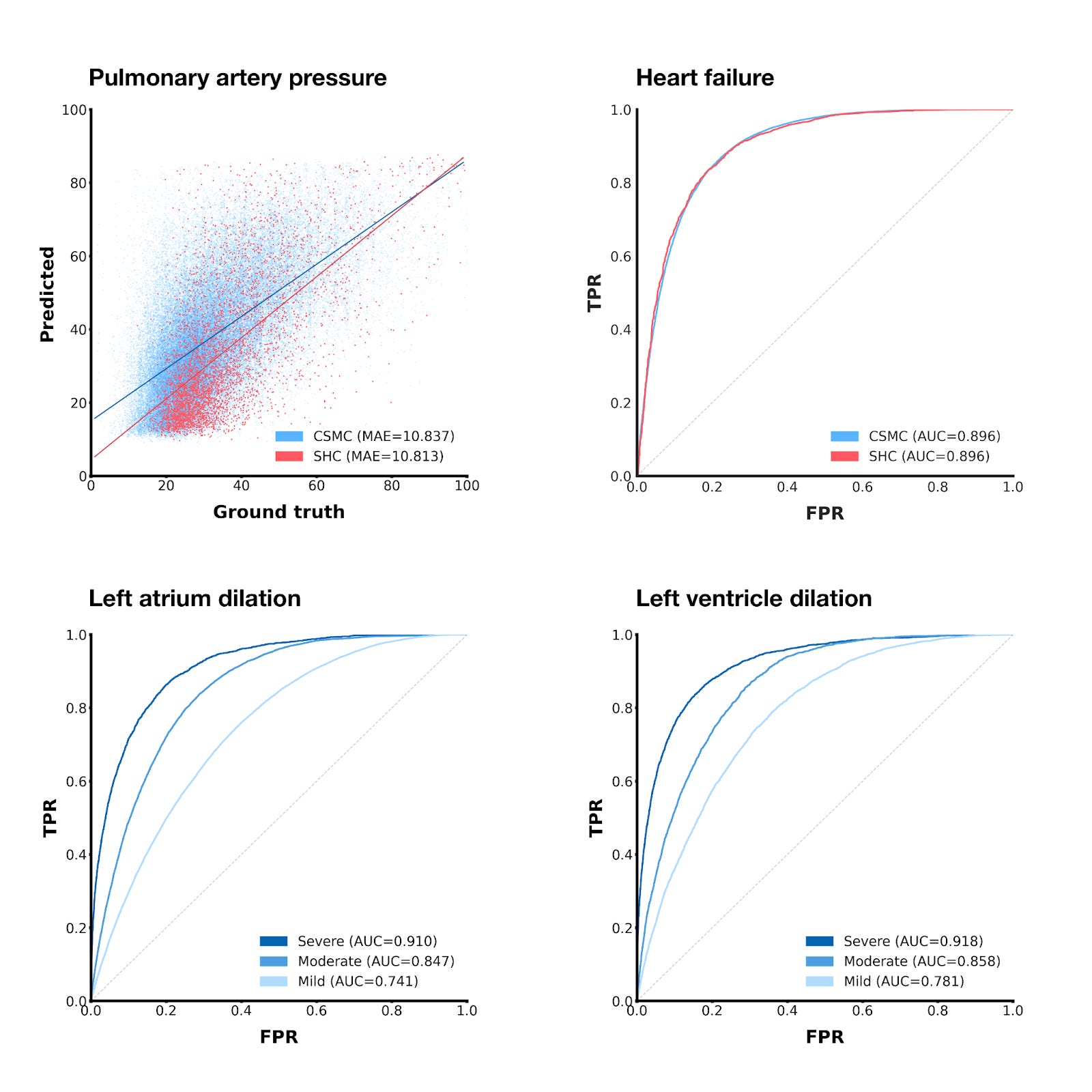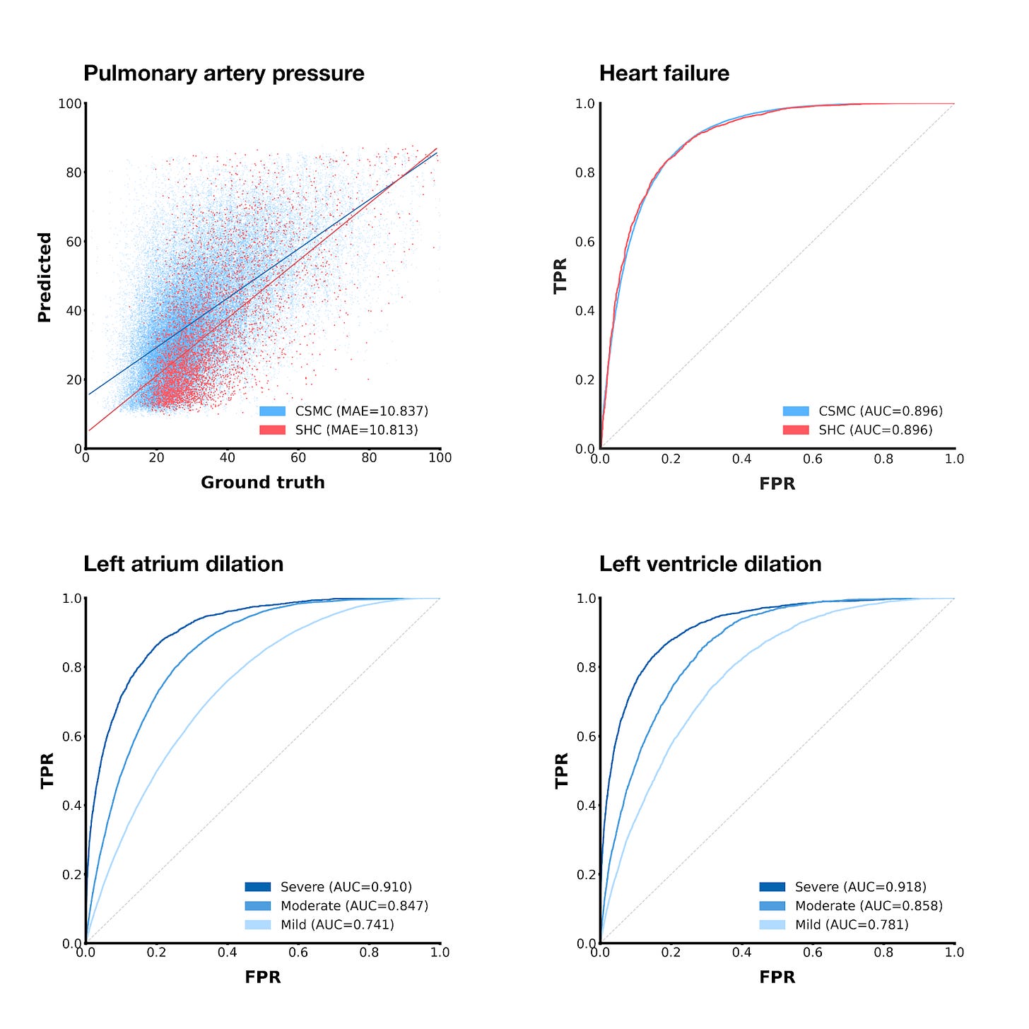 For the chamber size prediction tasks, EchoCLIP’s prediction performance improves as the severity of the condition increases, which makes sense—severe conditions do intuitively seem like they should be easier to detect.