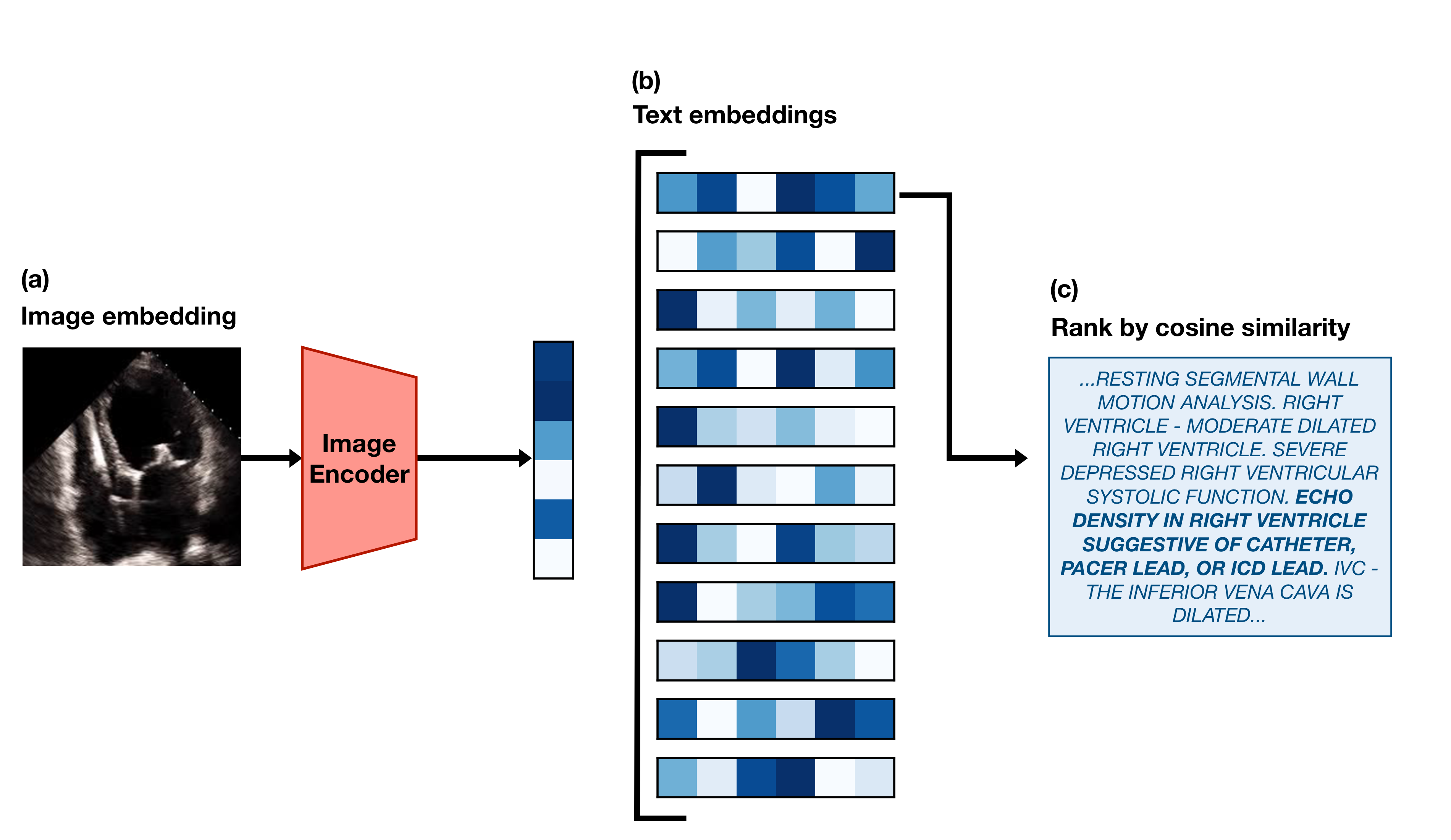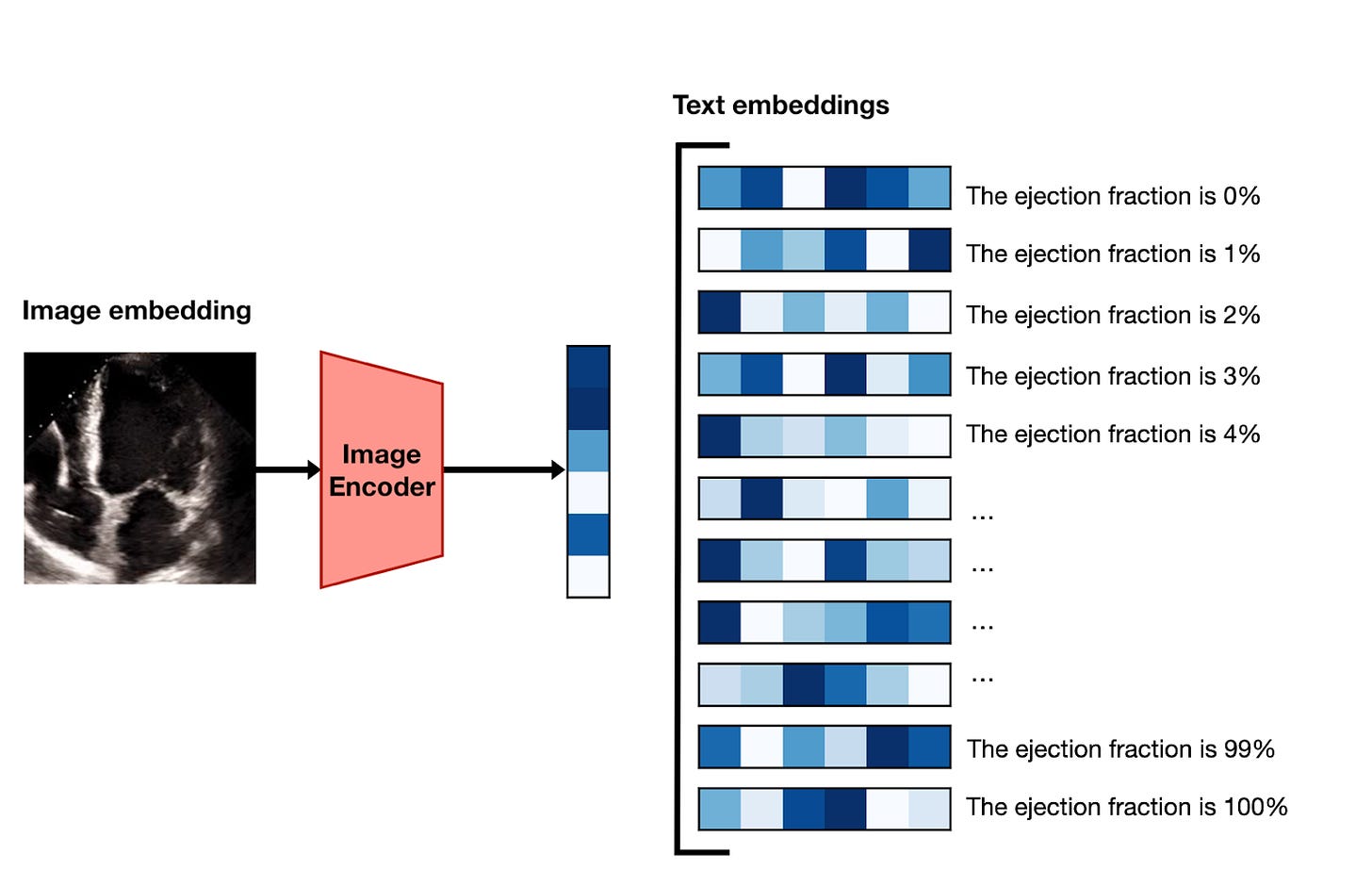 If you’re following along, you might be curious how it’s possible to take two models that turn text and images into embeddings, and use them to predict a continuous value like ejection fraction. The gist1 of the method is as follows: