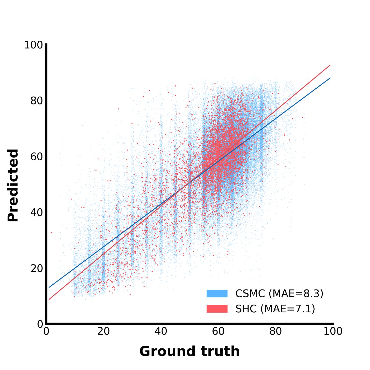 And… it works well! In this scatterplot, the blue dots are examples from our internal test set, while the red dots come from an entirely different hospital and serve as external validation. Our model can clearly zero-shot-predict ejection fraction, and decently well too. For reference, the mean difference between two human experts on this task is around 7-10%, so we’re not awfully far off from human-level performance! This is neat because the models was not explicitly trained to do this, but it learned to do it out of necessity to satisfy the simple, broad training objective given to it.